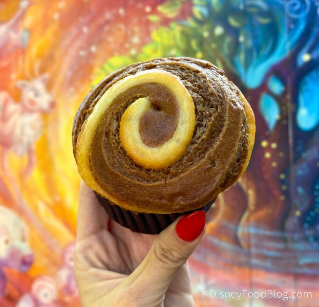 We found the Gingerbread Muffin at the cart outside of Pizzafari Heading towards Pandora for $3.99. We love that Animal Kingdom has recently been adding more breakfast options, even at the carts! We’ll keep an eye out for even more breakfast foods there and let you know what we find!