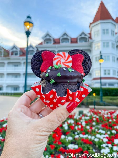 This treat is made of a cookies ‘n cream-filled chocolate cupcake topped with chocolate ganache, holiday sprinkles, 2 Oreo Minnie Ears, a white chocolate bow colored red, and a sugar cube peppermint accent!