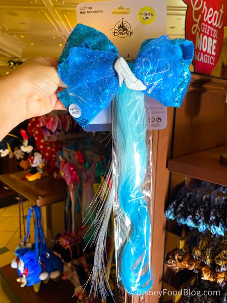 These hair bows feature long strips that light-up. The Cinderella Light-Up Hair Bow has a glass slipper on it!