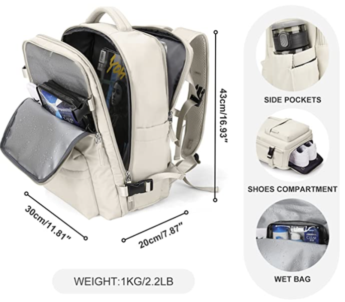 It’s also helpful to have a bag with different sized compartments, like a backpack, to help keep things organized for easier access. This also makes it easier when going through security at the parks. This bag has a compartment for your shoes, a wet pocket, and it can be used as a carry on! On top of that, there’s a charging cable.