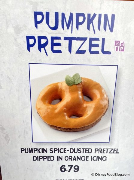 Oh, the sad saga of the Pumpkin Pretzel. This poor unfortunate soul was one of the holiday offerings served up at Thirsty River Bar and Trek Snacks in Animal Kingdom last holiday season. And based on the menu photo and description, it looks pretty promising, right? An icing covered spft pretzel sounded de-light-ful.