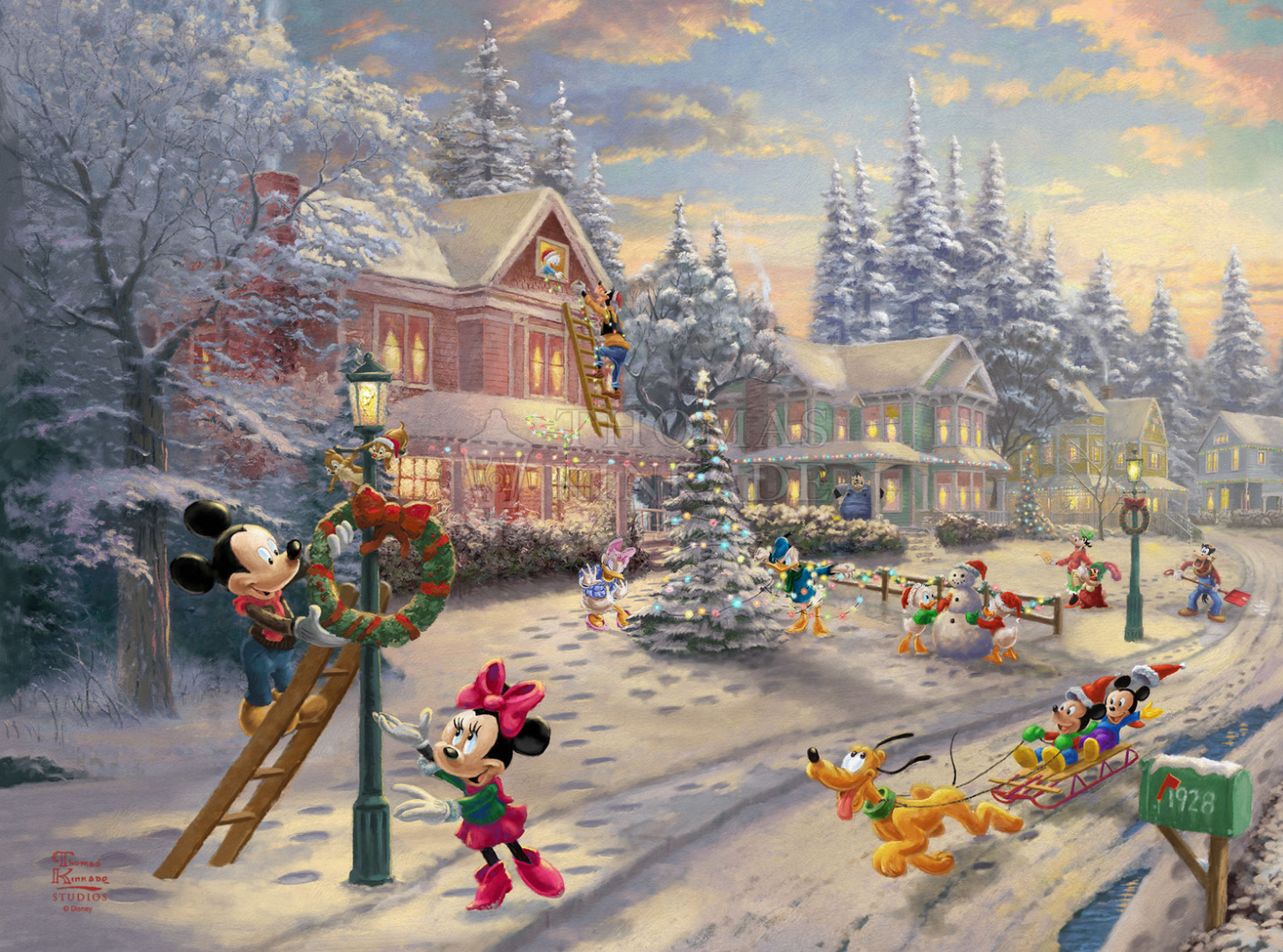 Disney Christmas movies are playing non-stop and there are enough holiday sweaters to last us until next year. We just found an incredibly cozy canvas created by Thomas Kinkade that we want to share with you. The print is filled with Disney characters and hidden Easter eggs that any fan would appreciate!