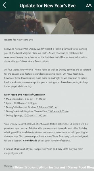 Disney recently confirmed certain offerings that will be available for New Year’s Eve. This was sent as an email to registered hotel guests with an upcoming stay booked through New Year’s Eve. A huge thank you to our reader Brian (@bcvandy64 via Instagram) for sending us this information. First, Disney noted the hours the parks will be open on New Year’s Eve, which are as follows: