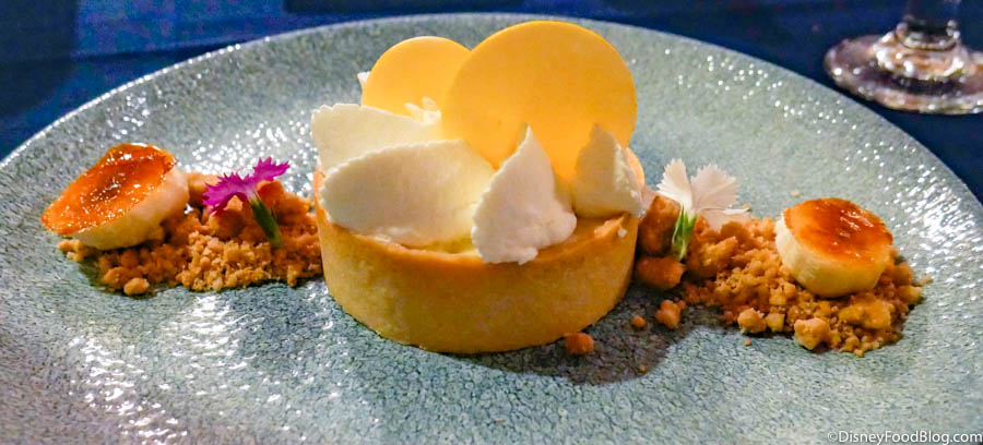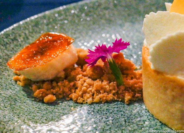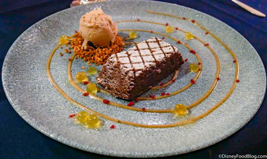 Finally, the Carrot Cake caught us by surprise. It is a southern-style plant-based carrot cake with pineapple popping boba (to remind you we’re in Disney World 😂), praline croquant, salted caramel, and a plant-based candied pecan-coconut milk frozen dessert. Oddly, the presentation made it look like a hunk of steak to us with the crisscrossy pattern!