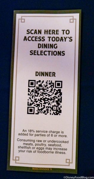 Like many other Disney World restaurants, the dinner menu was offered as a QR code instead of the regular paper menus. This allows for an even more contact-free dining experience.