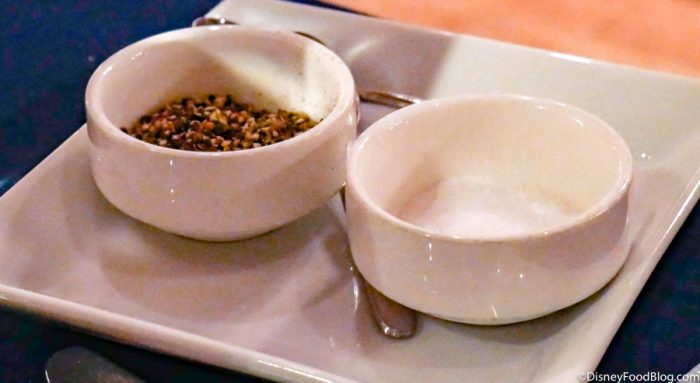Speaking of seasonings, we were served cute little serving bowls of salt and pepper for our use during our meal! Salt and pepper shakers are not on the tables at this time, so this was a nice option to be able to season our food.