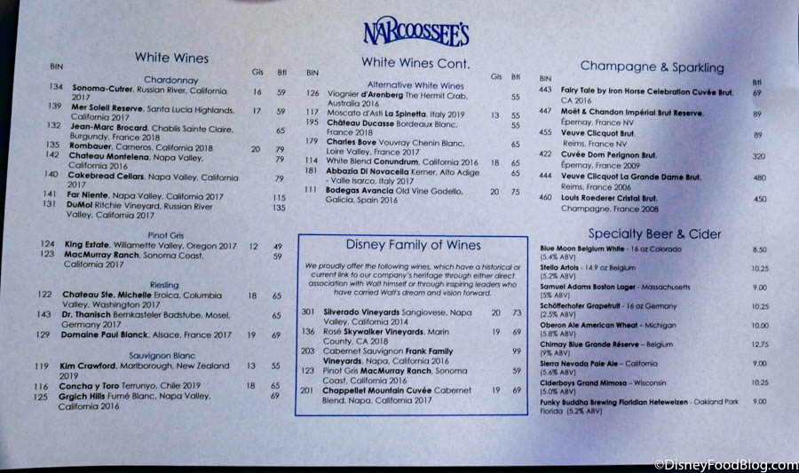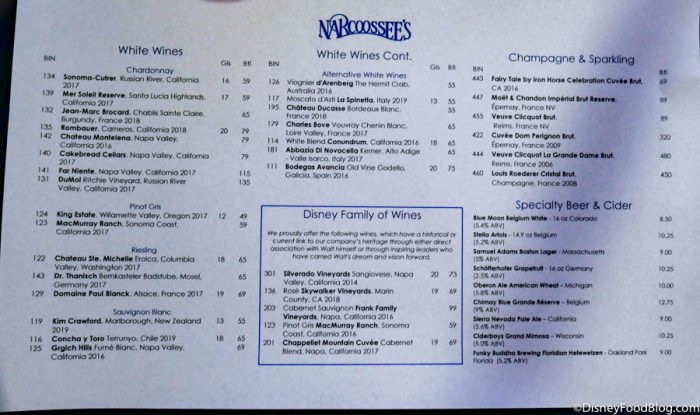 On the other side of the drink menu, you can find white wines including options from the Disney Family of Wines, champagne, beer, and cider.