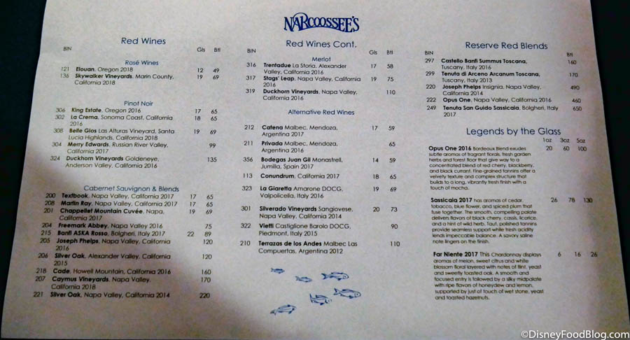 Narcoossee’s menu has plenty to choose from when it comes to drinks, even following the lengthy closure. The wine menu in particular is quite extensive. This was given to us on a printed paper menu. The menu is broken into a list of red wines to choose from, and guests can purchase by the glass or by the bottle.