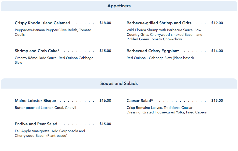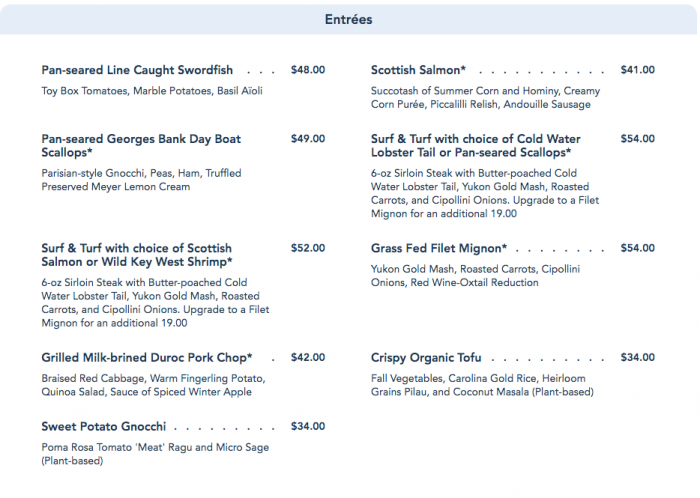 When the Dining Plan was available before the closures, this restaurant was considered a two-credit meal, but with or without the Dining Plan, this is an expensive meal! If you’re 200% looking for seafood, there are honestly better, cheaper choices in Disney World like The Boathouse in Disney Springs. But if your heart is set on dining in that big octagon on the water you see as the monorail cruises around the Grand Floridian, it’s there waiting for you, but it’ll cost ya a pretty penny.