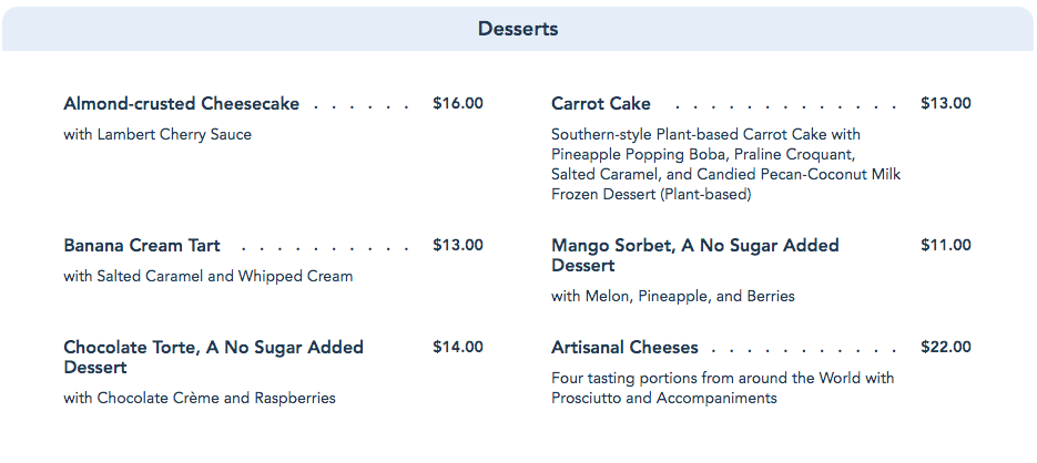 For dessert, there are a few options ranging from cakes to cheesecakes to artisanal cheeses.