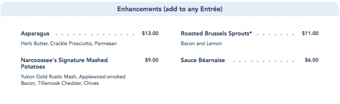 Guests can add a little extra to their meals with enhancements. These are essentially fancy side dishes or sauces that you can order along with your main course.