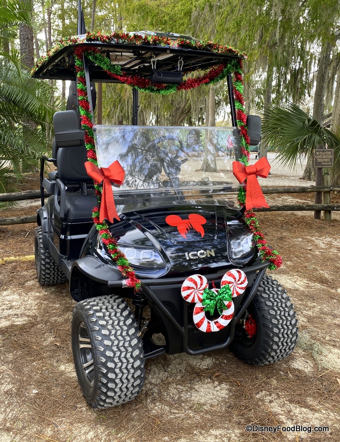 This festive golf cart features a candy cane Mickey wreath and matching tinsel…