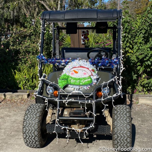 Each year, campground guests dress up their campsites and golf carts with the most extravagant designs! The guests are back with some super awesome decorations this year! Take a look at this cart with an ENTIRE inflatable set tied to the roof. Mickey, Minnie, Rudolph are hitching a ride to the nearest campfire.