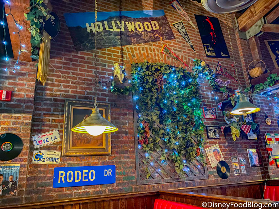One of our favorite parts about this restaurant is the decor! In the waiting area and entryway, you can see photos of various celebs on the walls. Wanna know the interesting backstory on these guys? Well back in the day when (then) MGM Studios first opened, they had a special thing called the Star Today promotion. Basically, a “celebrity” (we’ll use that term loosely 😉) would be scheduled to be in MGM on any given day to meet guests and sign autographs…just like REAL Hollywood, get it?! The program only survived about a year, but when it was done, the story goes that Imagineers saved the photos the celebs would use when signing autographs and hung them on the walls as one of Mama Melrose’s mementos she had saved over the years.