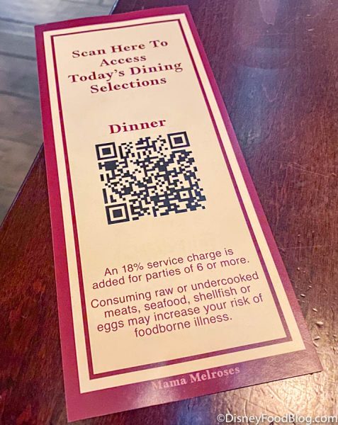 Even though we were given a hardcopy menu, we also had a QR code that would pull up the dinner menu on our phone. This has become popular since Disney World’s reopening to lower the number of touchpoints.