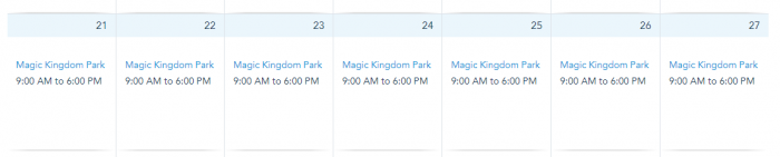 First, let’s take a look at Magic Kingdom. Disney World’s OG park is open from 9AM-6PM every day of the week — that’s 9 hours of theme park fun!