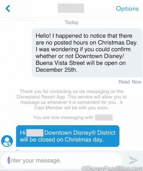 Earlier today, we noticed that the Disneyland App was not showing any hours for Downtown Disney on Christmas Day, December 25th, and instead was saying that Downtown Disney would be closed.