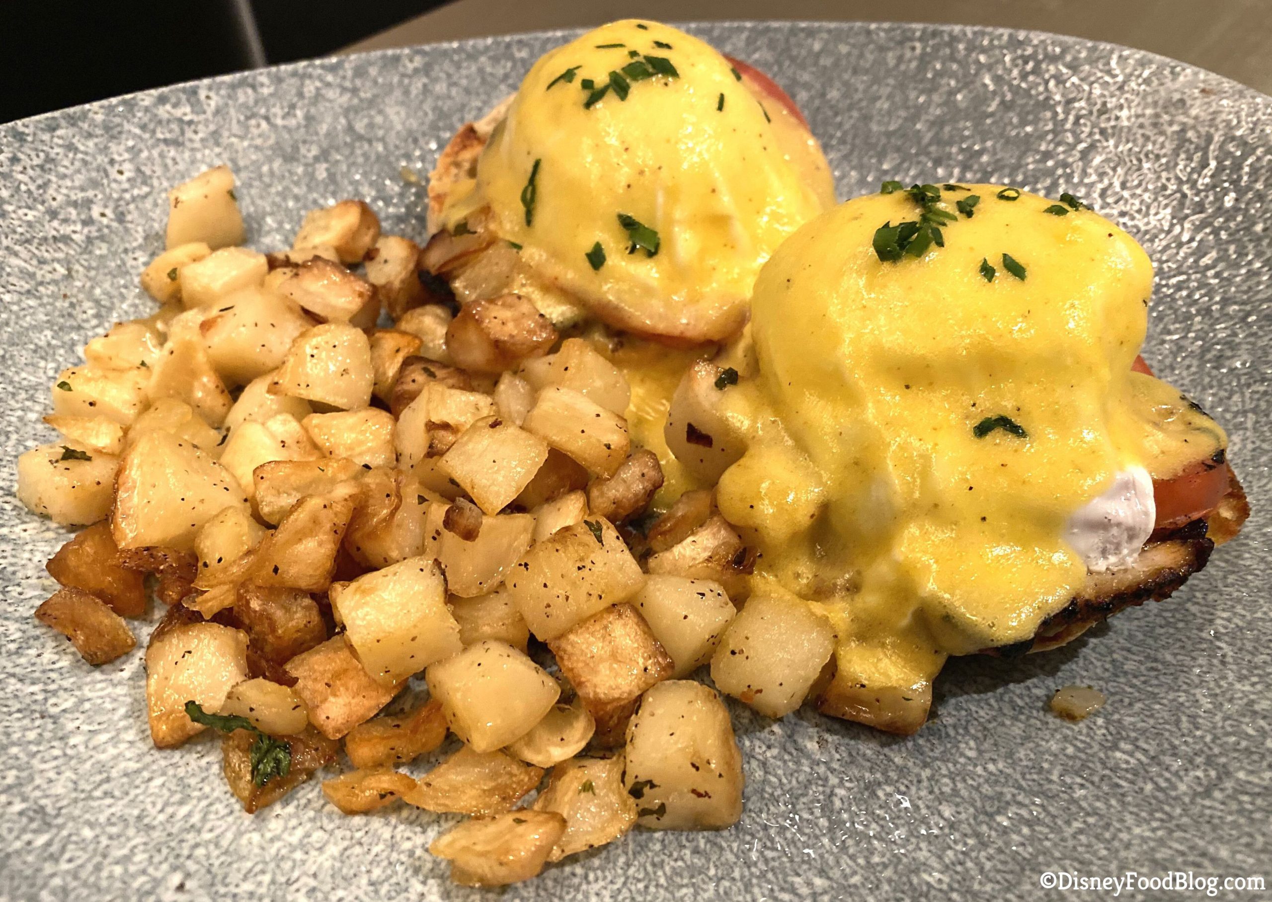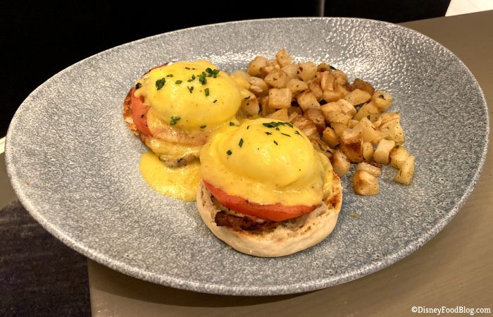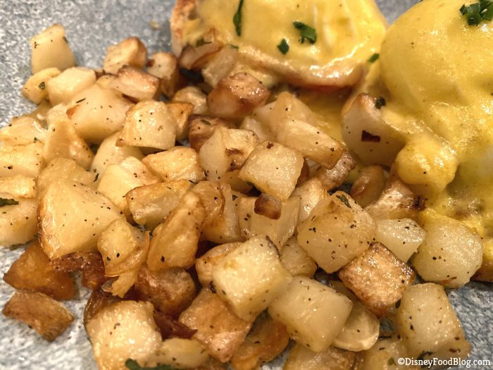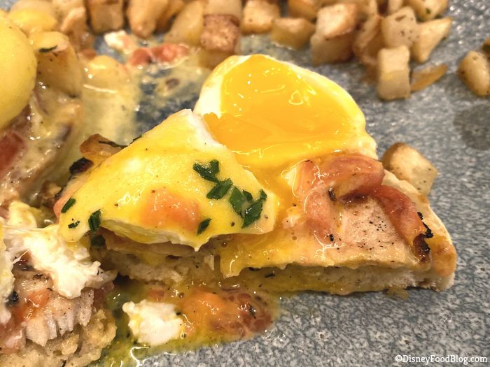 The eggs were poached perfectly and were super runny, like they’re supposed to be. If you are a big fan of eggs, these will likely make you happy. We thought these were some of the best poached eggs we’ve had at a Disney breakfast! They had that satisfying pop when you break through the whites and the yolk oozes out!