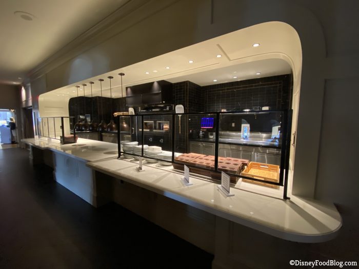 As you walk up to the front desk, you can see several health and safety measures in place. There is a plexiglass barrier at the check-in desk, as well as several signs with requirements for entering the restaurant. Mobile Dine Check-In is in use here, as it is at most other locations around Disney World. Simply scan the QR code near the entrance and from your phone you can check-in, specify any special needs, and wait to be texted when to head to the podium to be seated.