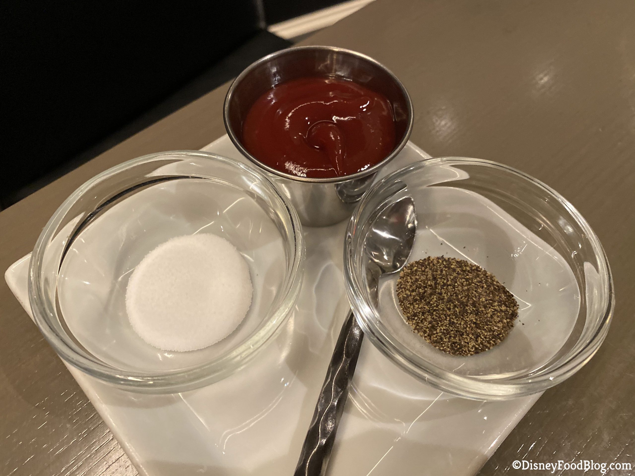 Before our food came out, we were given salt, pepper, and ketchup in individual containers. Salt and pepper shakers used to sit on the tables, but to create less points of contact, this is how seasoning and condiments are given to guests right now.