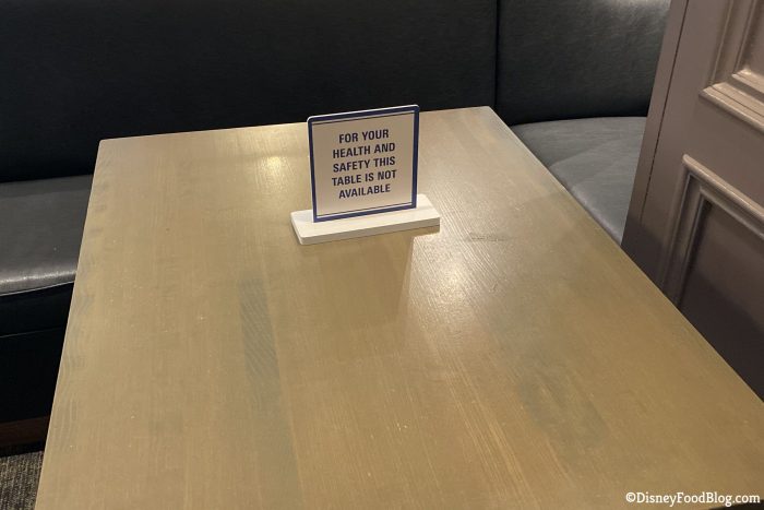 None of the tables have been removed from the dining room. To comply with physical distancing, many tables have signs stating that the table is not available. We have seen these at most of the reopened restaurants in Disney World.