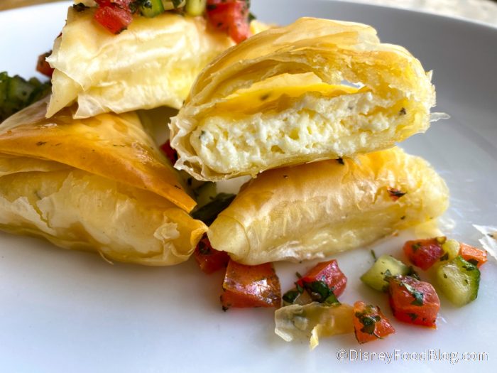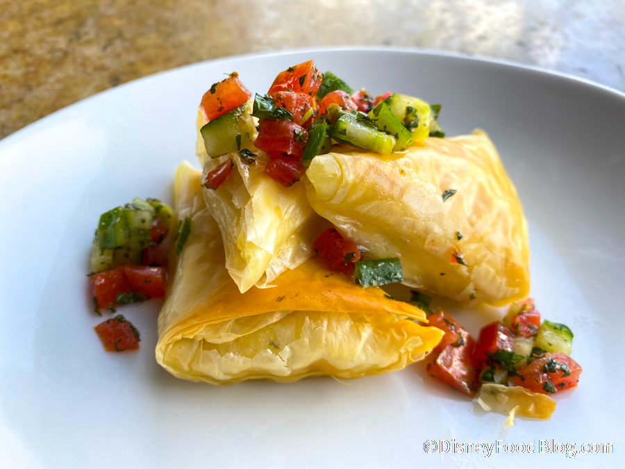 The Tiropitakia for $9 is Cheese-filled Phyllo with a Cucumber-Tomato Relish — seriously, you had us at “cheese.”