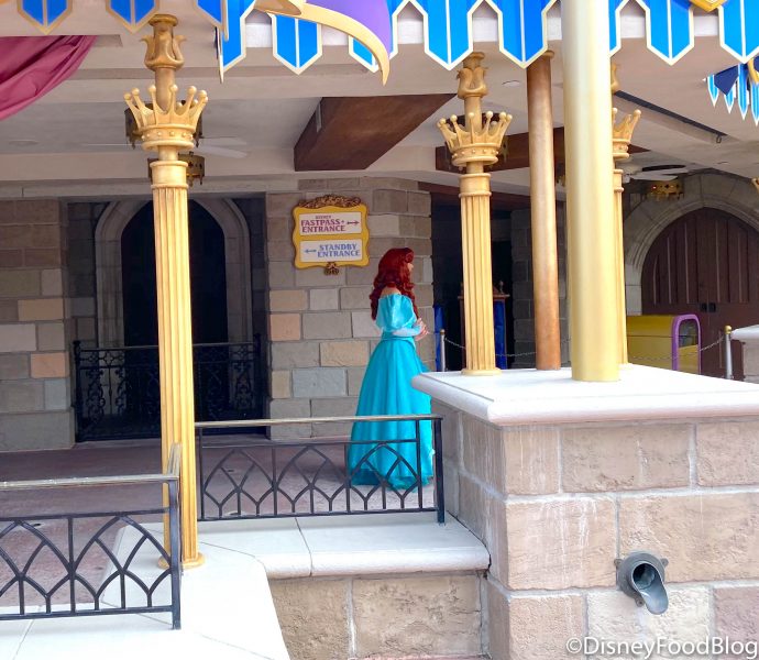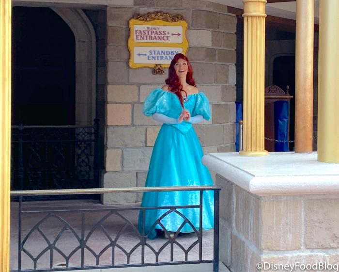 Characters have been out and about in the Magic Kingdom recently in distanced spots around the parks. During our last visit to the Magic Kingdom, we saw Ariel in her gorgeous teal dress greeting fans at the Princess Fairytale Hall.