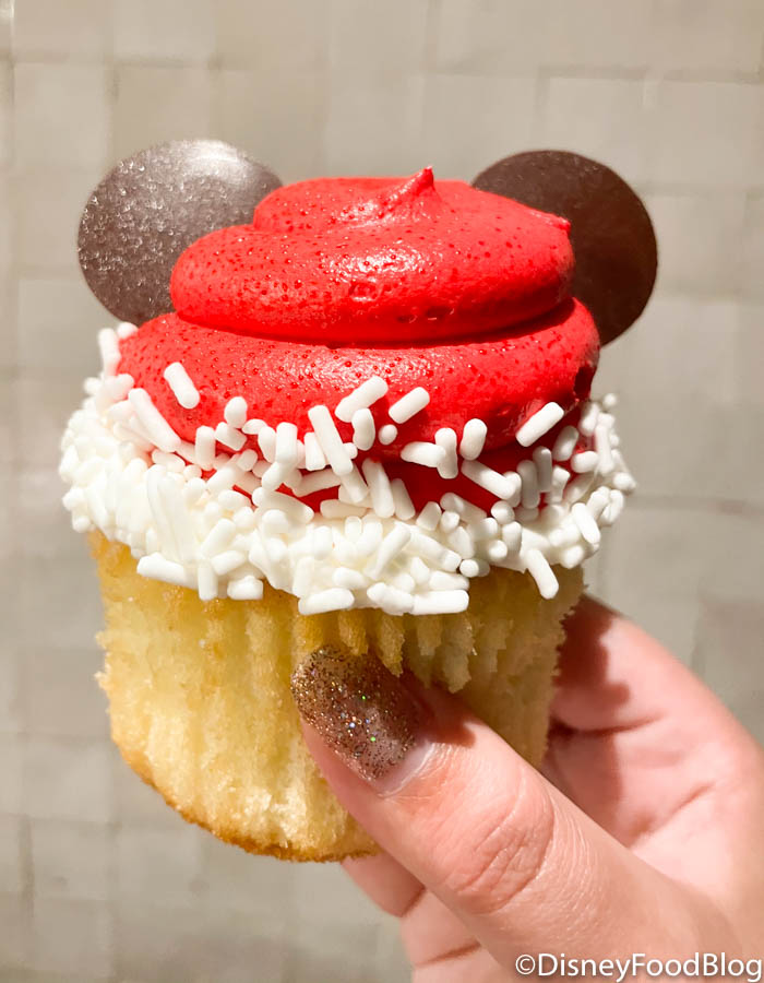 We found the Santa Mickey Cupcake over at The Market at Ale & Compass! This is a vanilla cupcake with vanilla icing, topped with white sprinkles and two chocolate Mickey ears. It’s SO cute, but how did it taste?