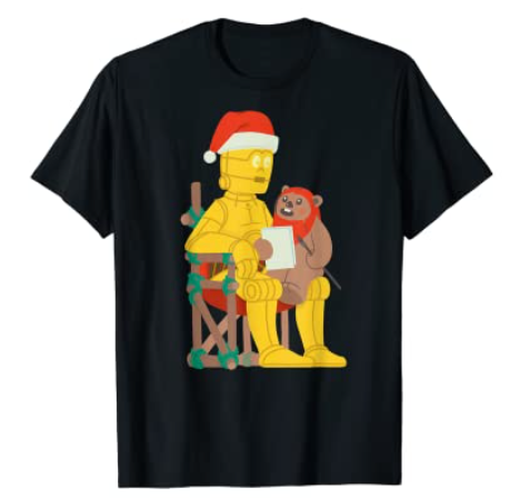 Have you ever wondered what C-3PO looks like dressed as Santa Claus? No? Us neither. Nevertheless, we just found out when we discovered this shirt, and now you know too! Santa C-3PO has a little Ewok on his lap, sharing his wish list for Christmas.