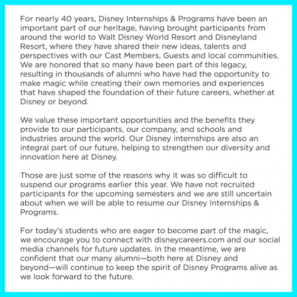 In it, Disney noted that Disney Internships & Programs have been an important part of the Company’s heritage for nearly 40 years. Participants from all over the world have come to Disney World and Disneyland to share their ideas and their talents. Disney noted that they value these important opportunities and noted that Disney internships are “an integral part” of the future of the Company.