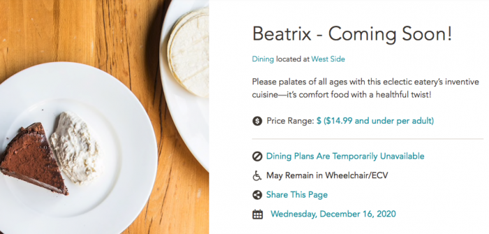 The Beatrix website still notes that the restaurant plans to open its Disney Springs location, and the Disney Springs website still lists this spot as “Coming Soon!”