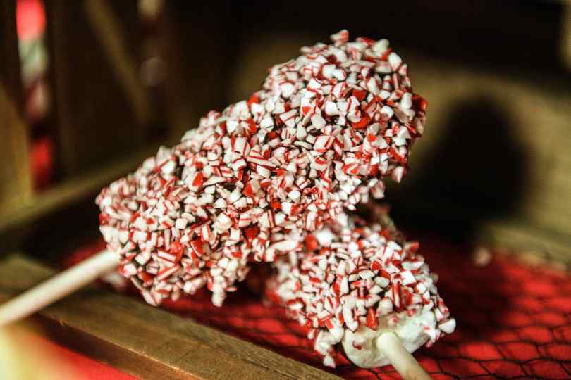 - Dip caramel-coated marshmallows into melted dark chocolate, gently tapping to remove excess chocolate. Gently roll wand in crushed peppermint; place on clean parchment paper. Repeat for all wands.