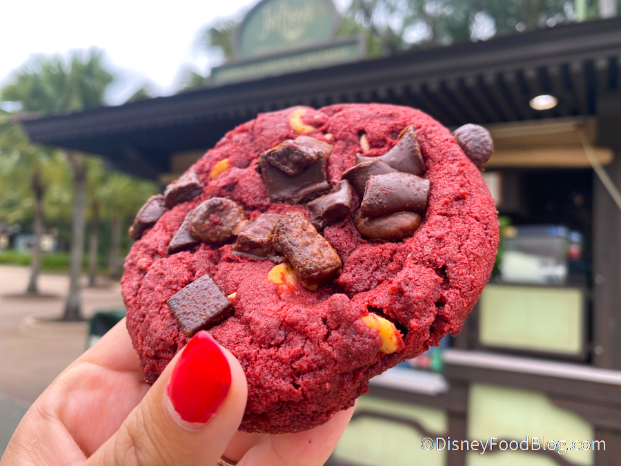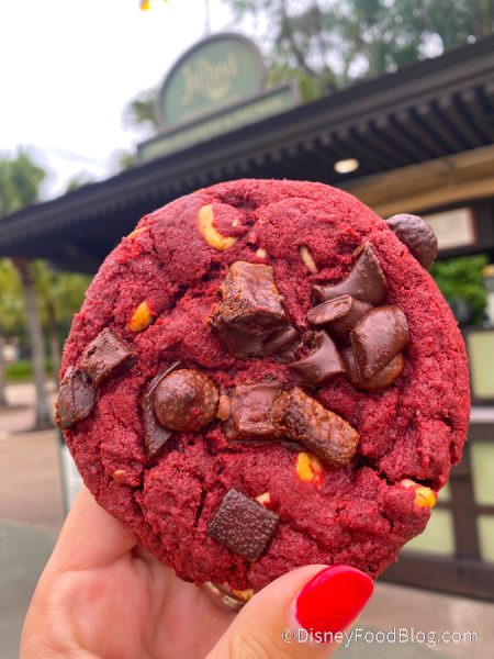 So you might think we’re sick of cookies, but NOPE! And we just found another NEW cookie today at Disney’s Animal Kingdom! And did we get it? Of course, we did! It’s a Red Velvet Double Chocolate Cookie — like seriously, you had us at “red velvet” and “double chocolate.”