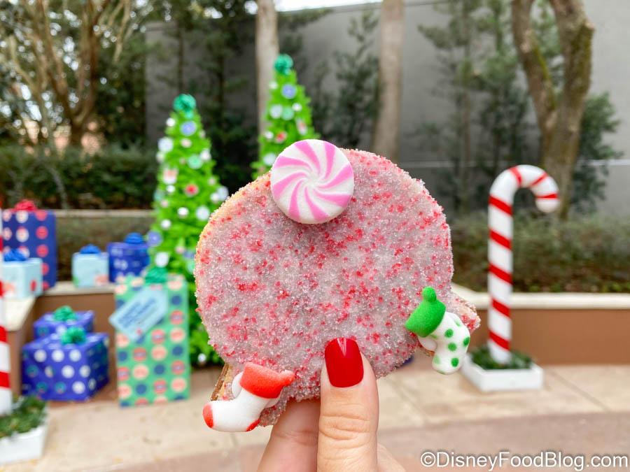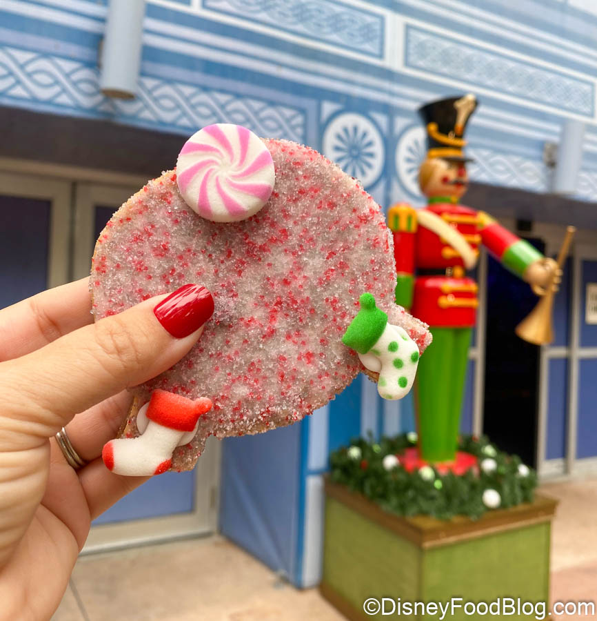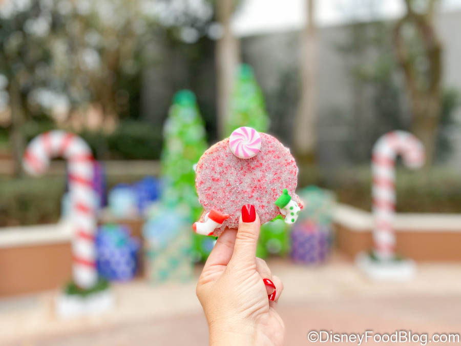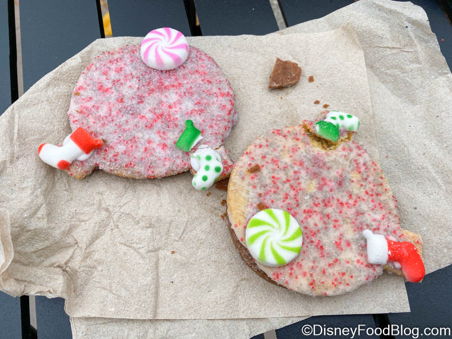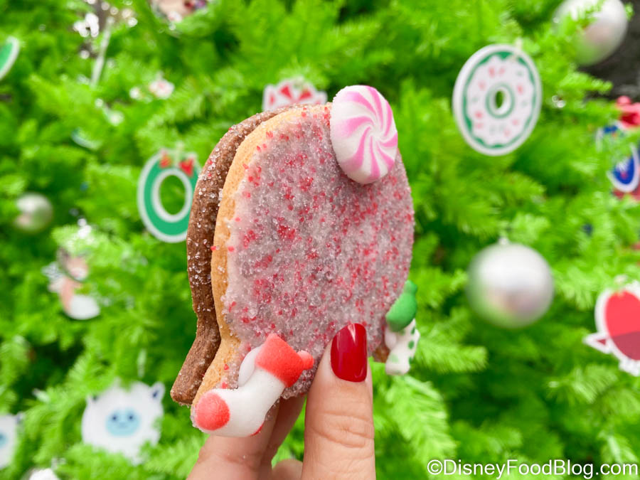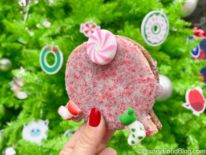 One of the Holiday Kitchens that we really enjoyed this year is Holiday Hearth, set up inside the World Showplace. This booth is home to a variety of festive desserts, including one that we enjoyed more than we expected to — the Salted Caramel Spaceship Earth Cookie (which you can get the recipe for here). Now, the Spaceship Earth Cookie has received a holiday makeover and we don’t really know how to feel about it… .