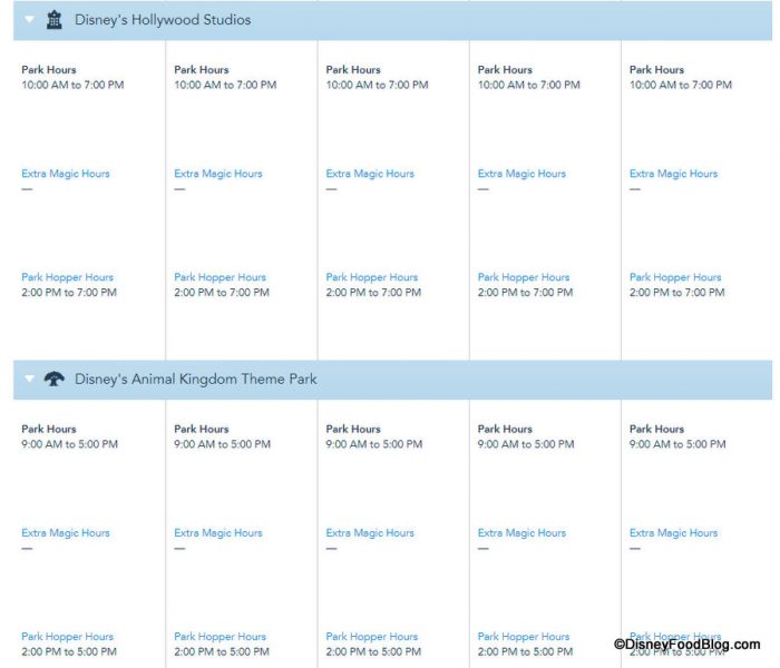 And this 2PM start does indeed appear to be exactly the case for each theme park: Magic Kingdom, EPCOT, Disney’s Hollywood Studios, and Disney’s Animal Kingdom. You can, of course, also see the listed hours for when each park will close, which can help you strategize your Park Hopping further.