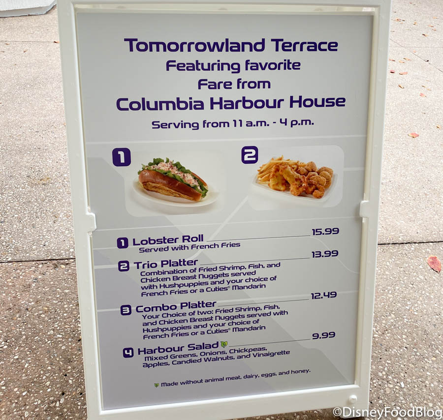 Sure, you can grab Ronto Wraps or Chesire Cat Tails in a new place now, but we’re looking at Tomorrowland Terrace because it seems to be serving up quite a few old favorites from Columbia Harbour House! The restaurant just reopened today with this new menu, and we had to see how it compared to the original.