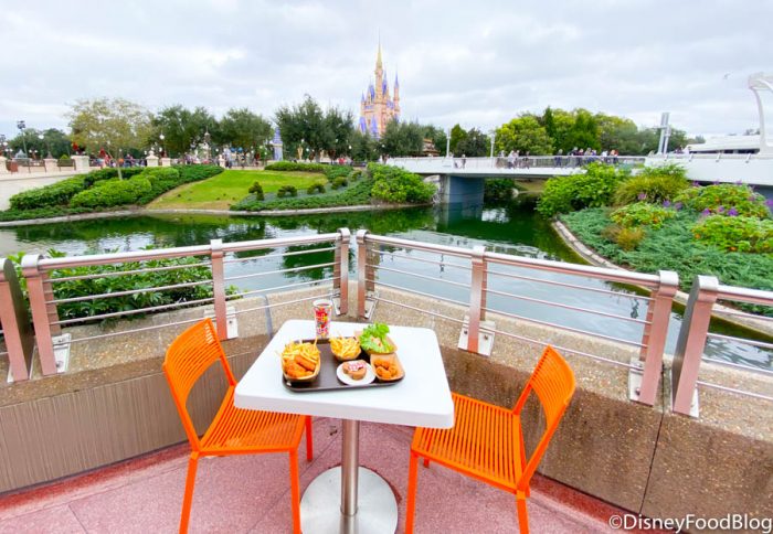 Tomorrowland Terrace is located right between Main Street, U.S.A. and Tomorrowland. From certain parts of the restaurant, you can snag gorgeous views of Cinderella Castle (like the table that we scored today, but more on that in a sec).
