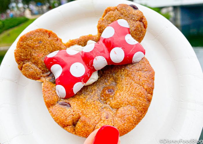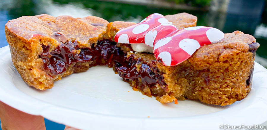 This treat has LOTS of warm, fudgy chocolate inside the cookie. It’s very cute and DEF shareable. That bow is colored white chocolate, so feel free to chomp down on Minnie’s favorite accessory!