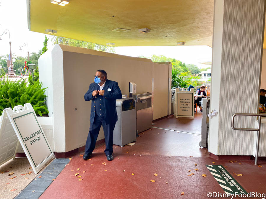 We were wondering whether the Relaxation Station would still be available here and it is! This spot was previously in use as one of the stations where guests could safely remove their masks. The lower level, castle-side seating is separate from the restaurant and still designated as a no-mask rest area.