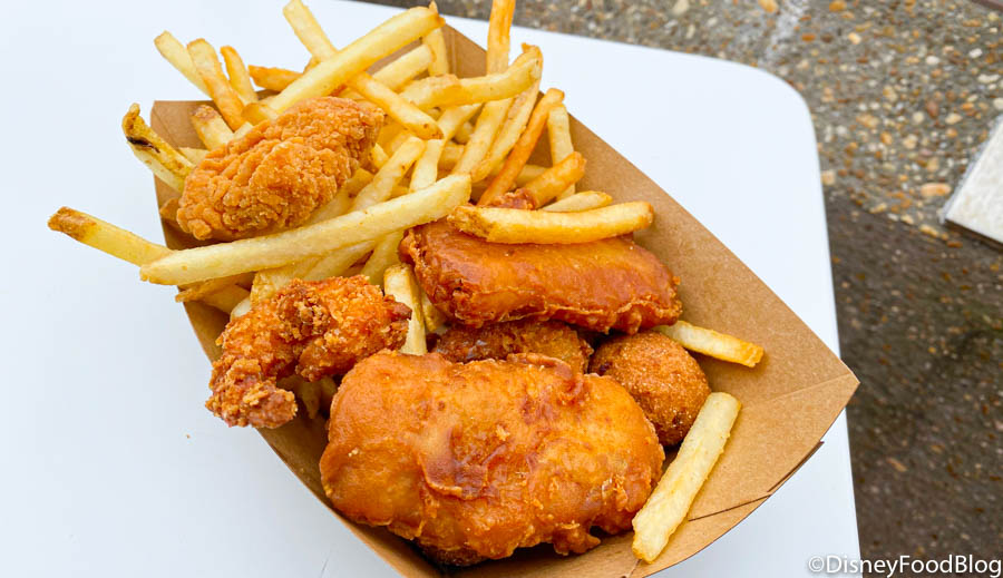 The fish was our favorite; it was a nicely cooked white filet. We wouldn’t say it was AS good as the fried fish in EPCOT’s U.K. Pavilion’s Yorkshire County Fish Shop, but close! The batter is a wet batter, like Yorkshires, so it comes out extra crispy. The chicken was standard Disney nuggets (meaning: yummy and still good!) and the shrimp was good too but nothing special flavor-wise. We liked it all and appreciated the variety, but we might just get the fish next time.