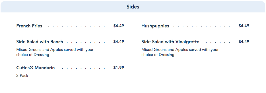 There are a number of sides ranging from salads to french fries to hushpuppies.