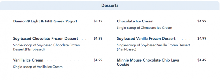 There are a few dessert options, and most of them involve ice cream or a soy-based frozen dessert. We did spy the yummy Minnie Mouse Chocolate Chip Lava Cookie that was at Columbia Harbour House prior to the closures!