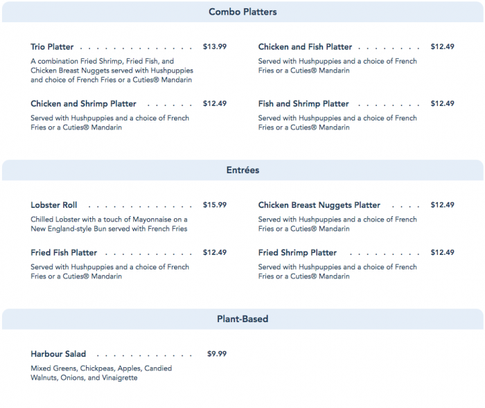 Before the Disney park closures, the menu looked like your average American food menu with burgers, chicken tenders, and salads. But now, the menu has gotten a full makeover, yet it looks very familiar! They are now offering several menu items from Columbia Harbour House’s menu! That location is still closed so we were excited to see that menu somewhere else, but we were hoping it’s just as good!
