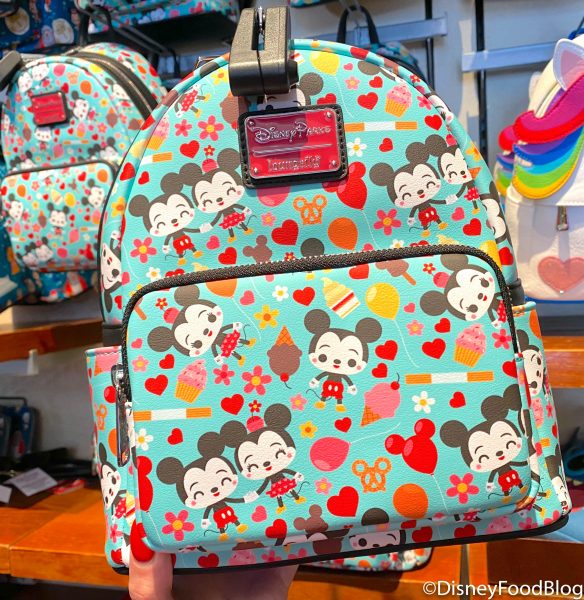 We spotted this Loungefly Mini Backpack both in the parks and online this week, and we have to say — this thing is adorably delicious! It’s a beautiful shade of blue, and it’s covered in a print of Mickey and Minnie with all of our favorite classic Disney parks snacks.