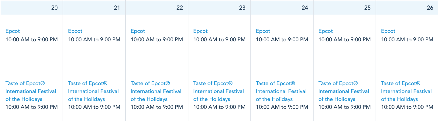 EPCOT will be open daily from 10AM-9PM. The Taste of EPCOT International Festival of the Holidays will also be open daily from 10AM-9PM. Keep in mind that we’re in the final days of the festival, which is scheduled to conclude on December 31st.