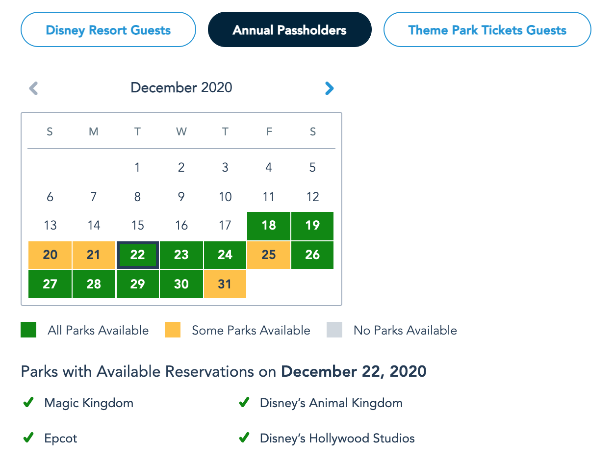 While Disney Resort Guests and Theme Park Ticket Guests have historically mirrored each other’s Park Pass Reservation availability, Annual Passholders typically have an entirely different availability calendar. This pattern holds true for the week of December 20th. On Sunday, December 20th, and Monday, December 21st, Annual Passholders can currently make reservations at Magic Kingdom, EPCOT, and Disney’s Animal Kingdom.