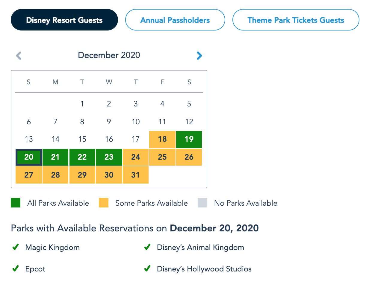 Disney Resort Guest Park Pass Reservation availability for December 20th as of December 18th © Disney