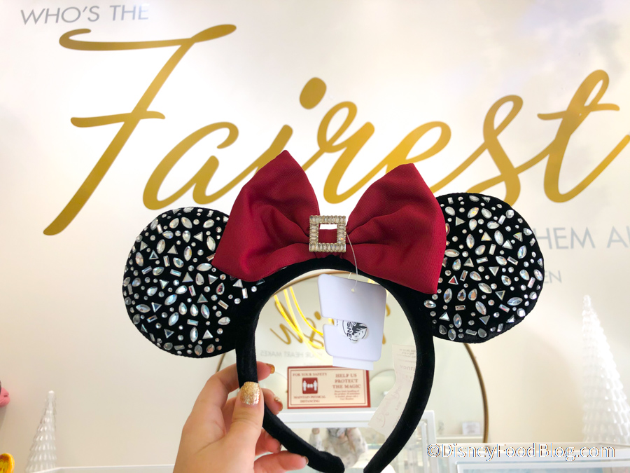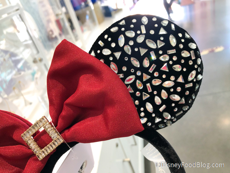 The black ears are bedazzled with LOTS of crystals and accentuated with a bright red bow right in the middle!