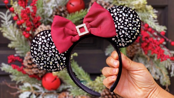 That’s right, you can now find the BaubleBar Designer Ears over on shopDisney! This design is really sparkly and eye-catching! Shimmering crystals decorate the black ears, and the red bow ties the headband together nicely!