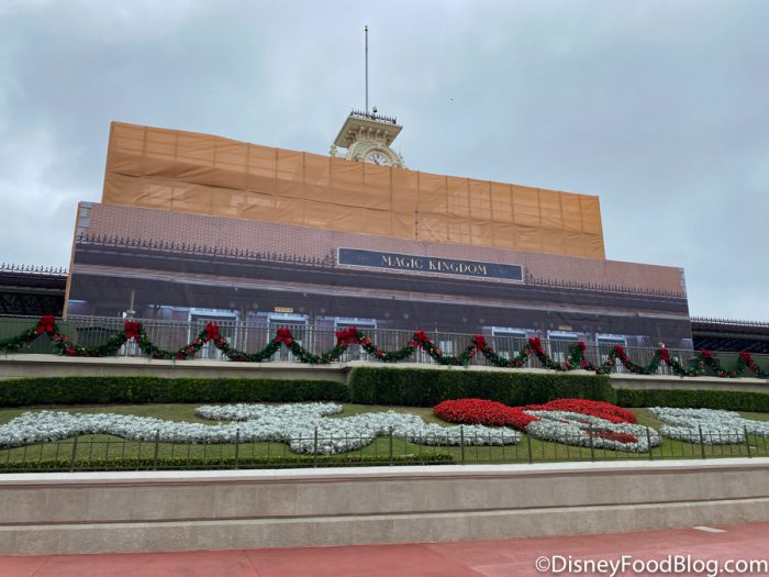 The Main Street Train Station is getting a little work done too. You’ll see a brown scrim covering the top half of the station and a facade covering the lower half. You can still visit the train station on the lower level.